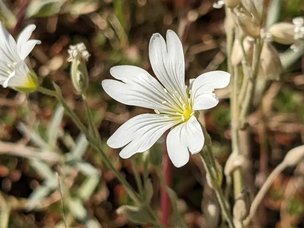 Cerastium tomentosum is a low-growing perennial known for its silvery-gray foliage and star-like white flowers that bloom in early summer.