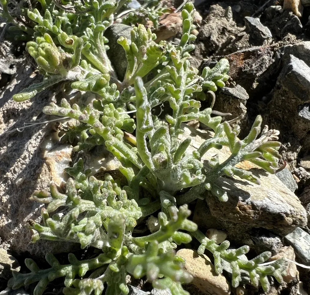 Chaenactis stevioides is an annual herb native to California and western North America, characterized by its woolly, fleshy leaves and yellowish flower heads.