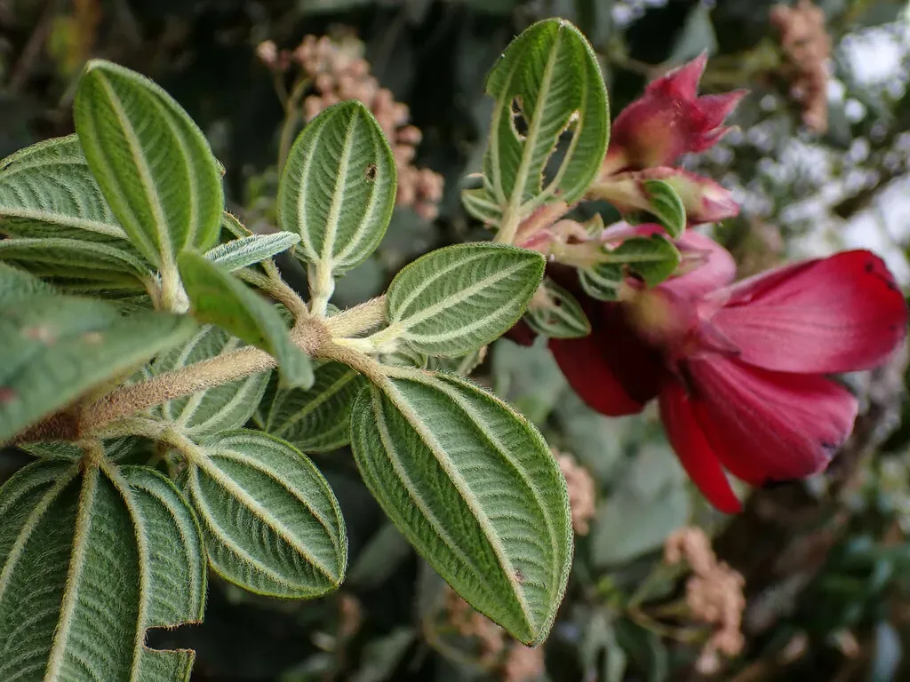 Chaetogastra grossa is a small tree or shrub native to Colombia, Ecuador, and Venezuela, known for its striking red flowers and fuzzy dark green leaves.