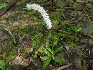 Chamaelirium luteum is a perennial herb native to eastern North America, known for its slender spike of small greenish-white flowers and basal rosette of oval leaves.