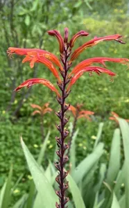 Chasmanthe floribunda is a vigorous bulbous perennial plant known for its tall, pyramidal spikes of vibrant orange flowers and long, narrow leaves.