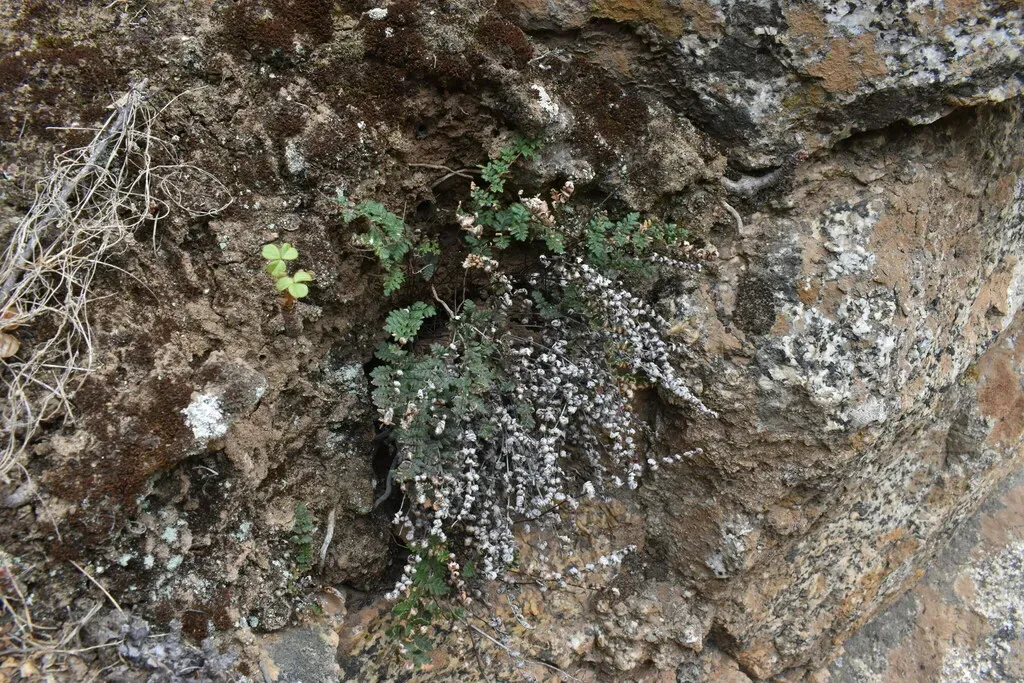 Cheilanthes hypoleuca is a perennial fern known for its delicate, lacy fronds and adaptability to dry, rocky environments.