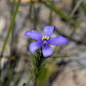 Cheiranthera alternifolia is a small shrub native to South Australia, known for its deep bluish-purple flowers with yellow stamens and linear dull green leaves.