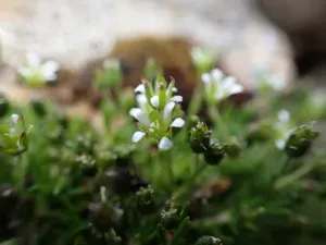 Mountain Stitchwort (Cherleria Biflora) is a perennial herb in the Caryophyllaceae family with moderate care difficulty. It requires moderate watering and full sun or partial shade light in USDA hardiness zones 4-8. This plant is safe for cats and dogs.