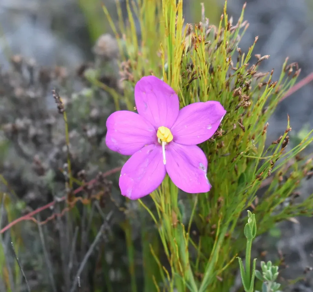 Chironia tetragona is a sticky, willowy annual or biennial plant reaching up to 60 cm in height. It has linear to oblong or ovate leaves and produces sticky pink flowers with a corolla tube 6-10 mm long, thickened in the throat.