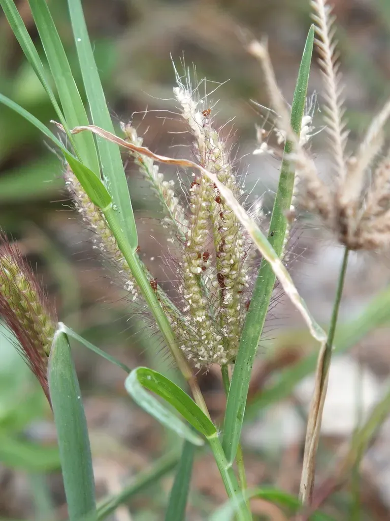 Chloris barbata is a tufted, erect, annual or short-lived perennial grass growing 0.3-1.0 m tall, characterized by loosely appressed spikes and three-awned spikelets.