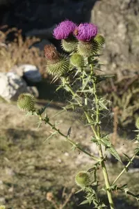 Cirsium ciliatum is a biennial or perennial thistle species characterized by its barbed, hairy leaves and striking purple flower heads.