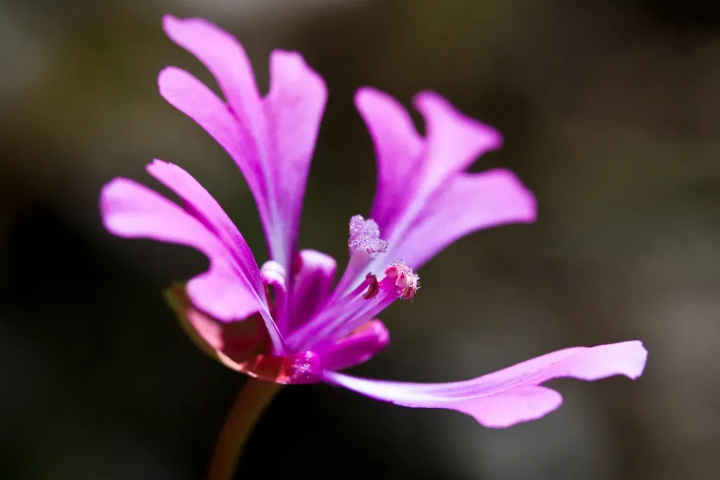 An annual herb native to California, known for its distinctive deep pink to red, deeply lobed, ribbon-like flowers.