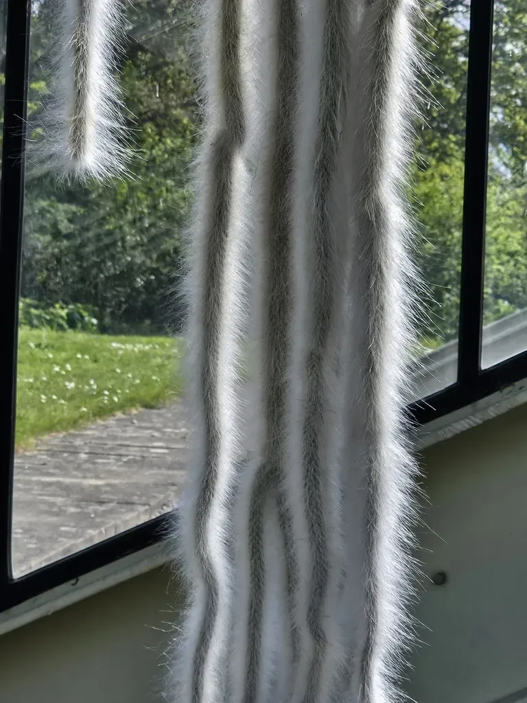 A perennial cactus species known for its long, cylindrical stems covered in dense, soft, white hairs and bright orange to salmon-pink flowers.