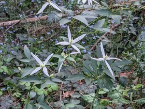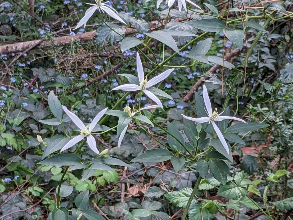 Clematis aristata is a vigorous twining climber with woody stems and bright green divided leaves composed of three heart-shaped leaflets. It produces clusters of white star-shaped flowers in spring.
