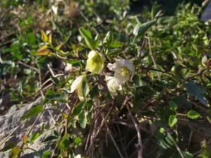 Clematis cirrhosa is a delicate twining evergreen or semi-evergreen vine native to the Mediterranean region, known for its early winter flowering with bell-shaped cream flowers often speckled with dark spots.