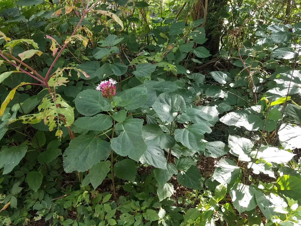 Clerodendrum bungei is a deciduous, suckering shrub known for its large clusters of showy pink flowers and heart-shaped leaves.