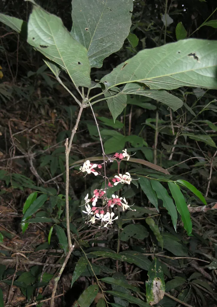Clerodendrum schmidtii is a rare, elegant flowering plant known for its spectacular winter blooming with cascading white flowers and deep green foliage.