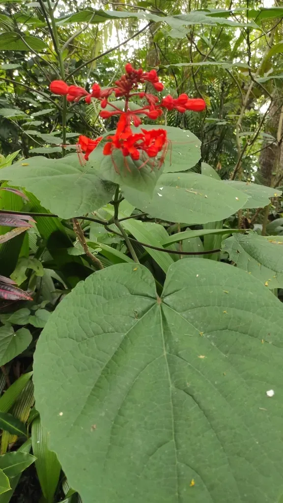 A tropical shrub or subshrub known for its striking scarlet-red flowers and lush green foliage.