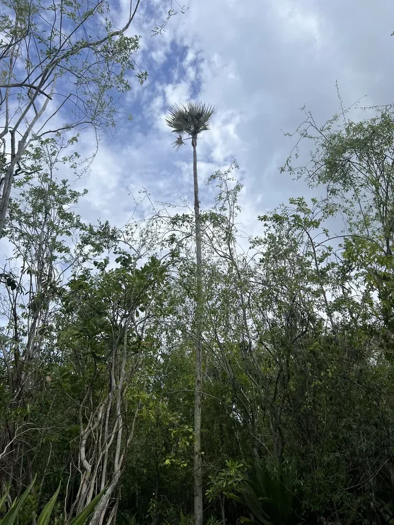 A medium-sized palm with a slender trunk and an open crown of deeply divided, nearly symmetrical fan-shaped leaves.