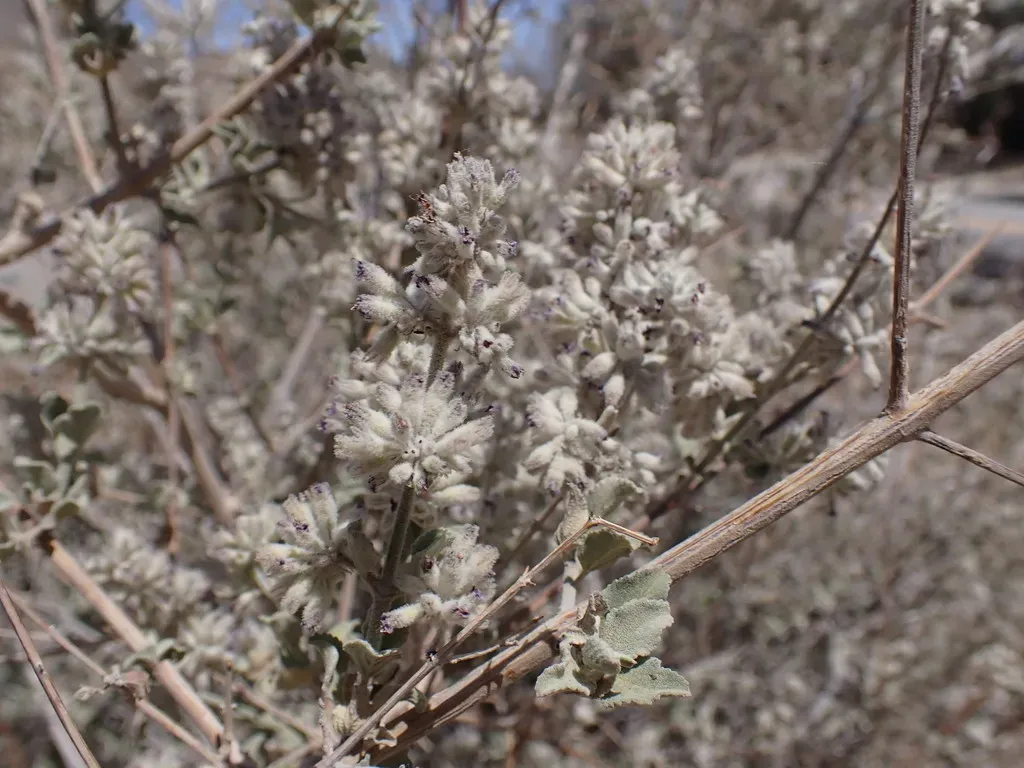 Condea emoryi, commonly known as Desert Lavender, is a multi-stemmed evergreen shrub with silvery gray, aromatic leaves and blue-violet flowers.