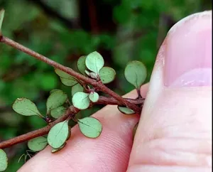 Coprosma crassifolia is a stiffly-branched, upright shrub native to New Zealand, known for its small, dark-green, round leaves and pale berries.
