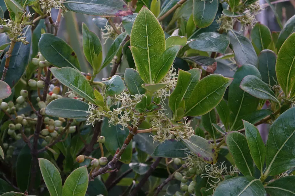 Coprosma lucida is a broadleaf evergreen shrub or small tree native to New Zealand, known for its glossy green leaves and orange fruit.