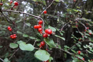 Coprosma rotundifolia is an evergreen shrub native to New Zealand, characterized by its rounded, often purple-blotched leaves and wide-angled, divaricating branches.