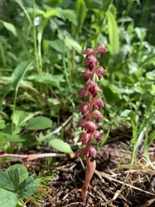 Striped Coralroot (Corallorhiza Striata) is a perennial herb in the Orchidaceae family with expert care difficulty. It requires moderate watering and partial shade or full shade or dappled_shade light in USDA hardiness zones 3-8. This plant is safe for cats and dogs.