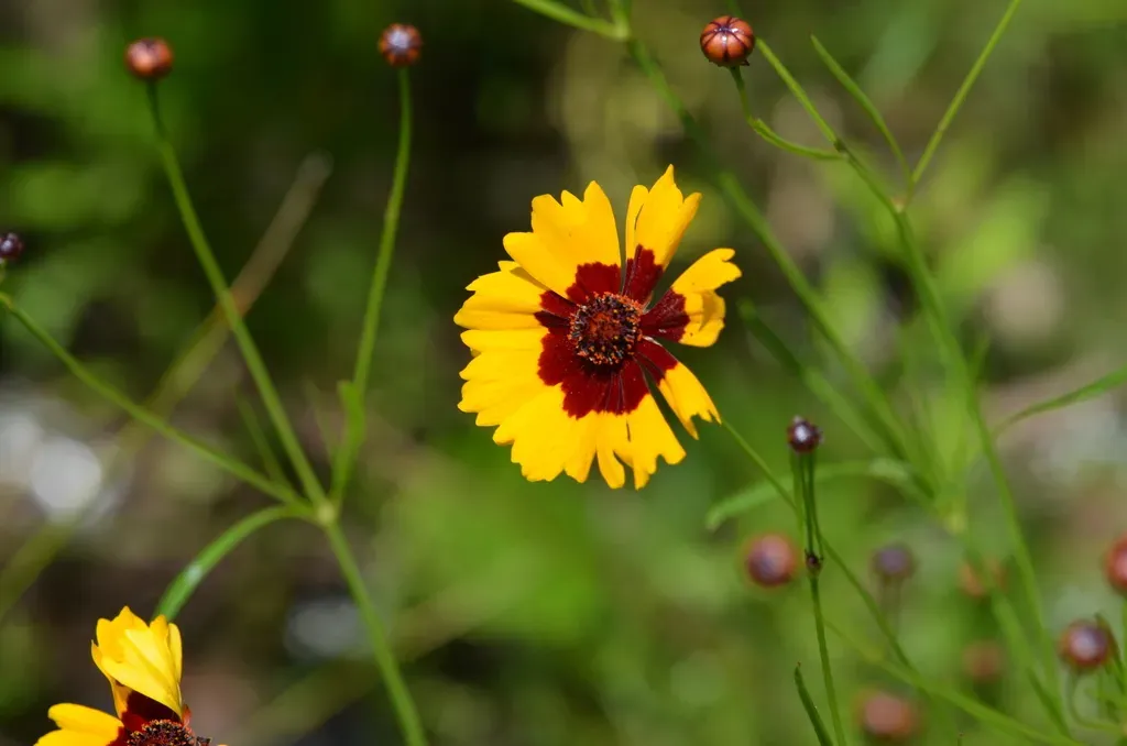 Coreopsis tinctoria is an annual wildflower native to the western and south-central United States, known for its bright yellow daisy-like flowers with reddish-brown centers.