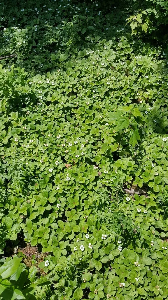 Bunchberry (Cornus Canadensis) is a perennial groundcover in the Cornaceae family with moderate care difficulty. It requires moderate watering and partial shade or full shade light in USDA hardiness zones 2-7. This plant is safe for cats and dogs.