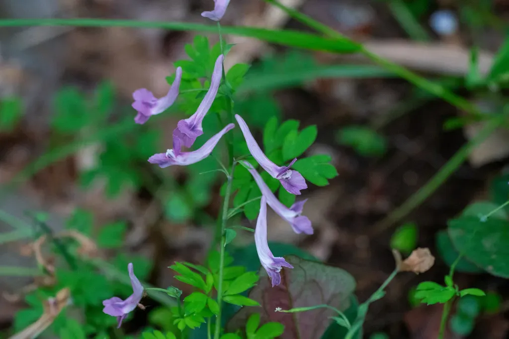 Corydalis decumbens is a herbaceous perennial plant with tuberous roots, known for its small, bilabiate flowers and pinnately divided leaves.