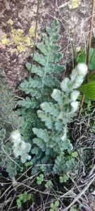 Cosentinie Velue (Cosentinia Vellea) is a perennial fern in the Pteridaceae family with moderate care difficulty. It requires moderate watering and partial shade or dappled_shade light in USDA hardiness zones 7-10. This plant is safe for cats and dogs.