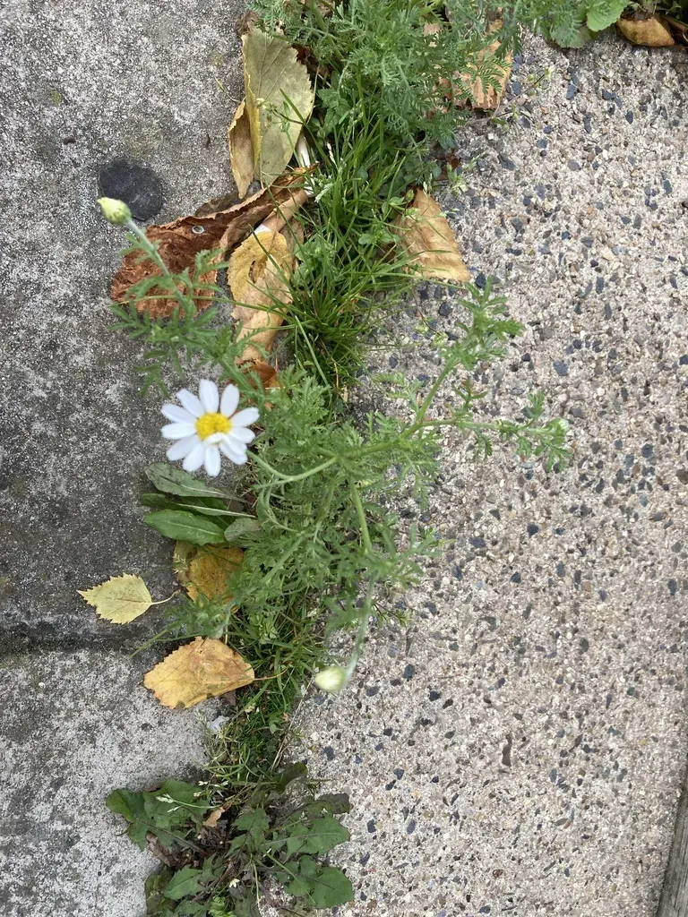 Austrian Chamomile is a daisy-like plant with finely divided leaves and white-petaled flowers.