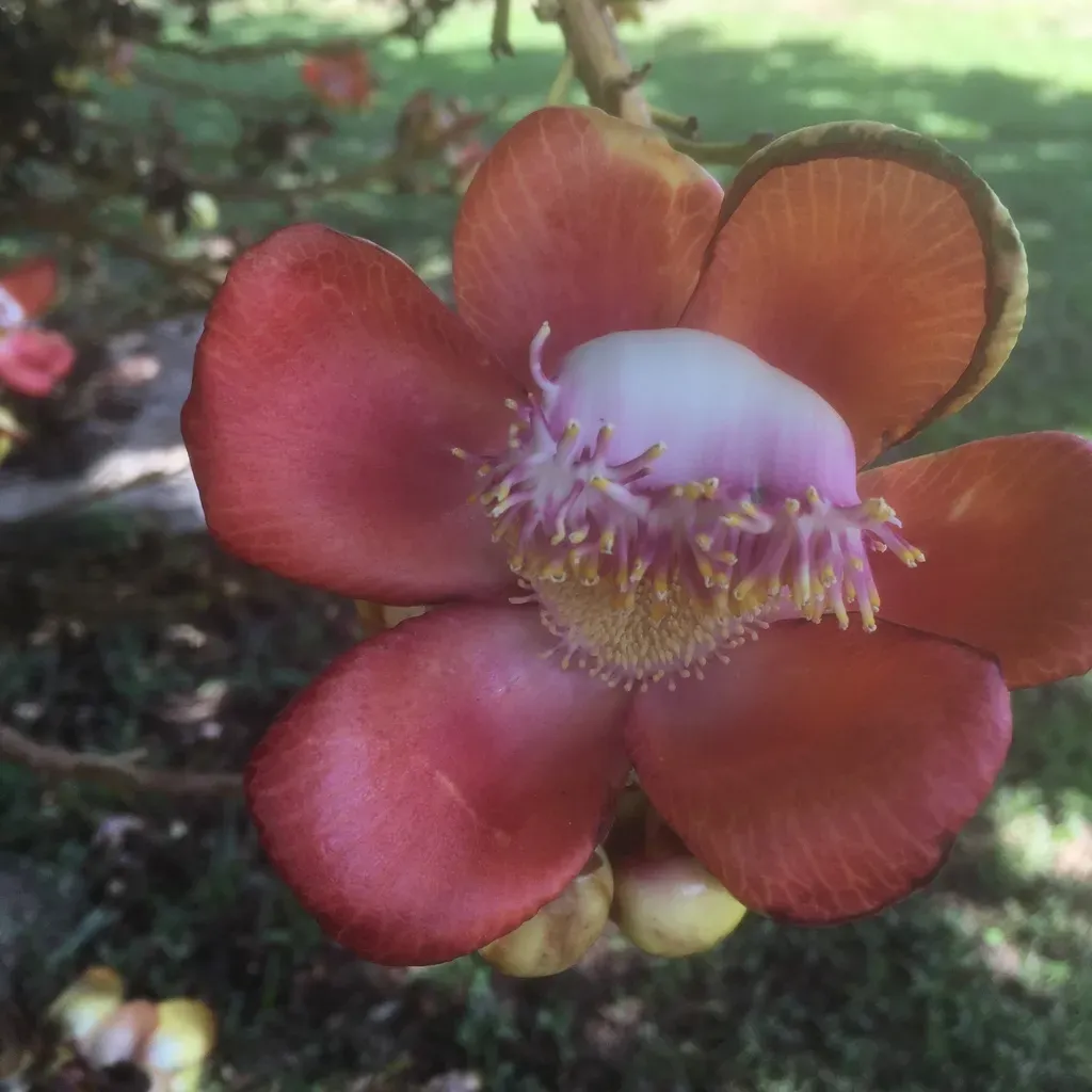 Couroupita guianensis is a large deciduous tropical tree known for its large, fragrant flowers and distinctive spherical fruits resembling cannonballs.