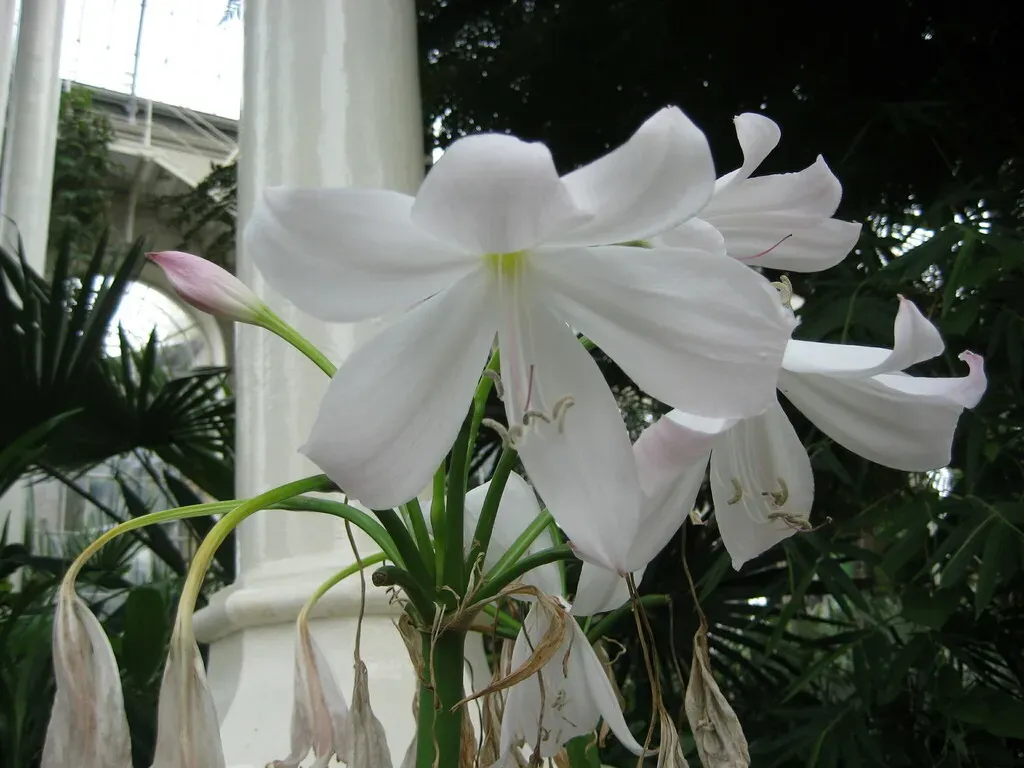 A large, bulbous, deciduous perennial native to southern Africa, known for its striking white to pinkish flowers and strap-like leaves.