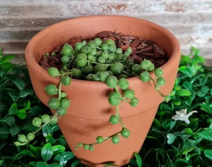 A trailing succulent vine with small, spherical, pea-shaped leaves resembling green pearls.