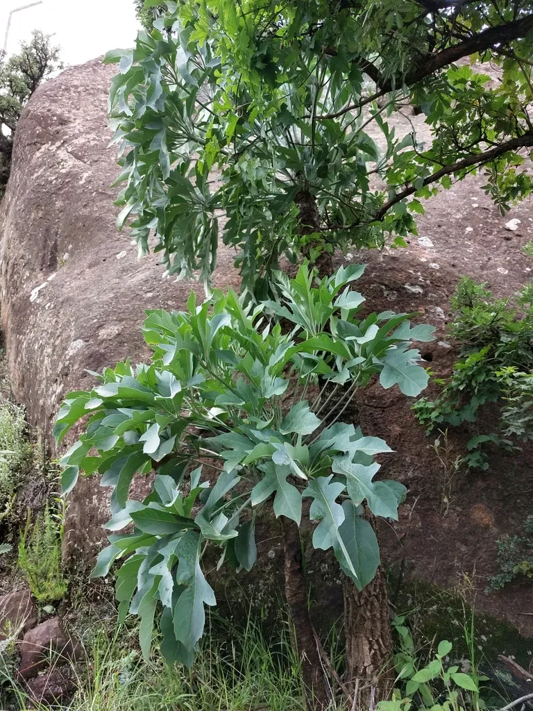 Cussonia paniculata is a short, thick-set, sparsely-branched evergreen tree with large, distinctive blue-green foliage and a corky trunk.