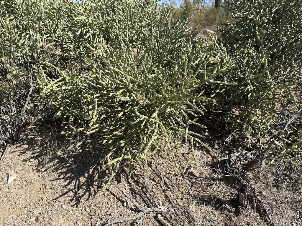 Arizona Pencil Cholla (Cylindropuntia Arbuscula) is a perennial cactus in the Cactaceae family with moderate care difficulty. It requires drought-tolerant watering and full sun light in USDA hardiness zones 8-11. This plant is toxic to cats and dogs — keep it out of reach of pets.