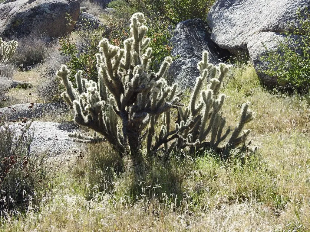 Gander's Buckhorn Cholla (Cylindropuntia Ganderi) is a perennial cactus in the Cactaceae family with moderate care difficulty. It requires drought-tolerant watering and full sun light in USDA hardiness zones 8-11. This plant is toxic to cats and dogs — keep it out of reach of pets.