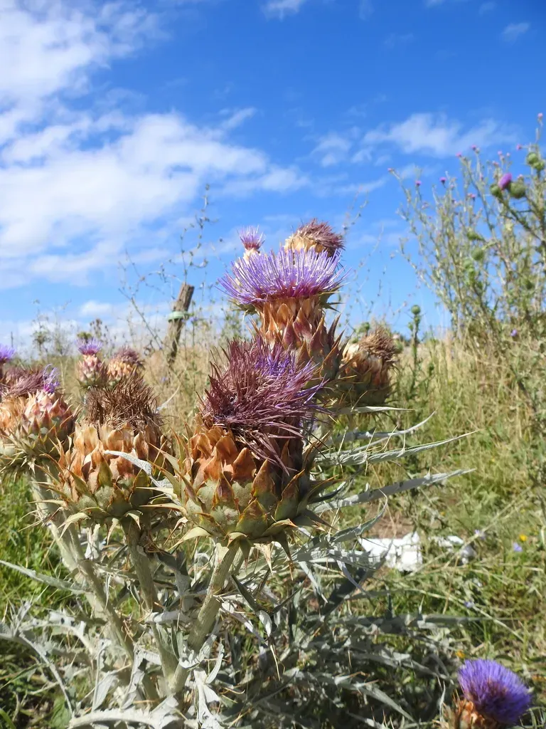 Cynara cardunculus, commonly known as cardoon or artichoke thistle, is a robust perennial plant with deeply lobed, spiny, gray-green foliage and large purple thistle-like flowers.