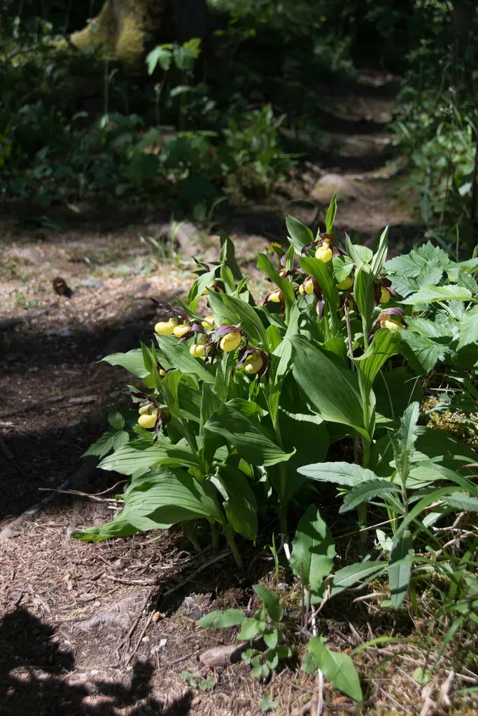 Lady's-slipper Orchid (Cypripedium Calceolus) is a perennial herb in the Orchidaceae family with moderate care difficulty. It requires moderate watering and partial shade or dappled_shade light in USDA hardiness zones 3-7. This plant is safe for cats and dogs.