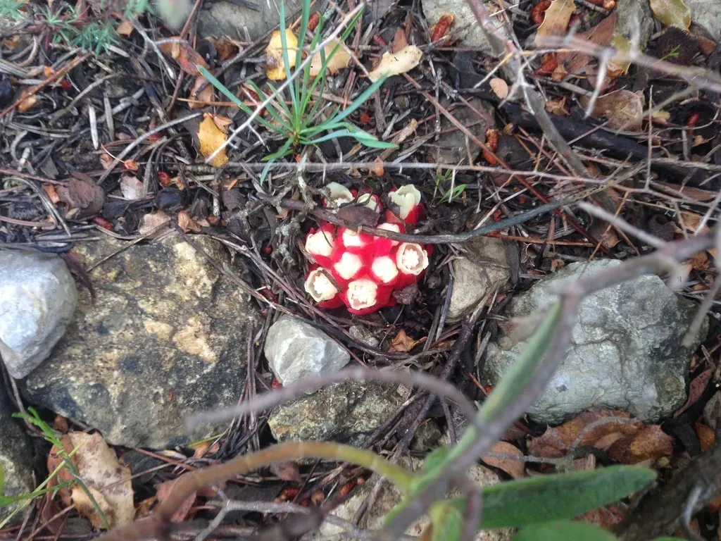 Cytinus ruber is a rare, holoparasitic flowering plant native to the Mediterranean region, known for its bright red inflorescence and complete dependence on host plants, particularly Cistus species.