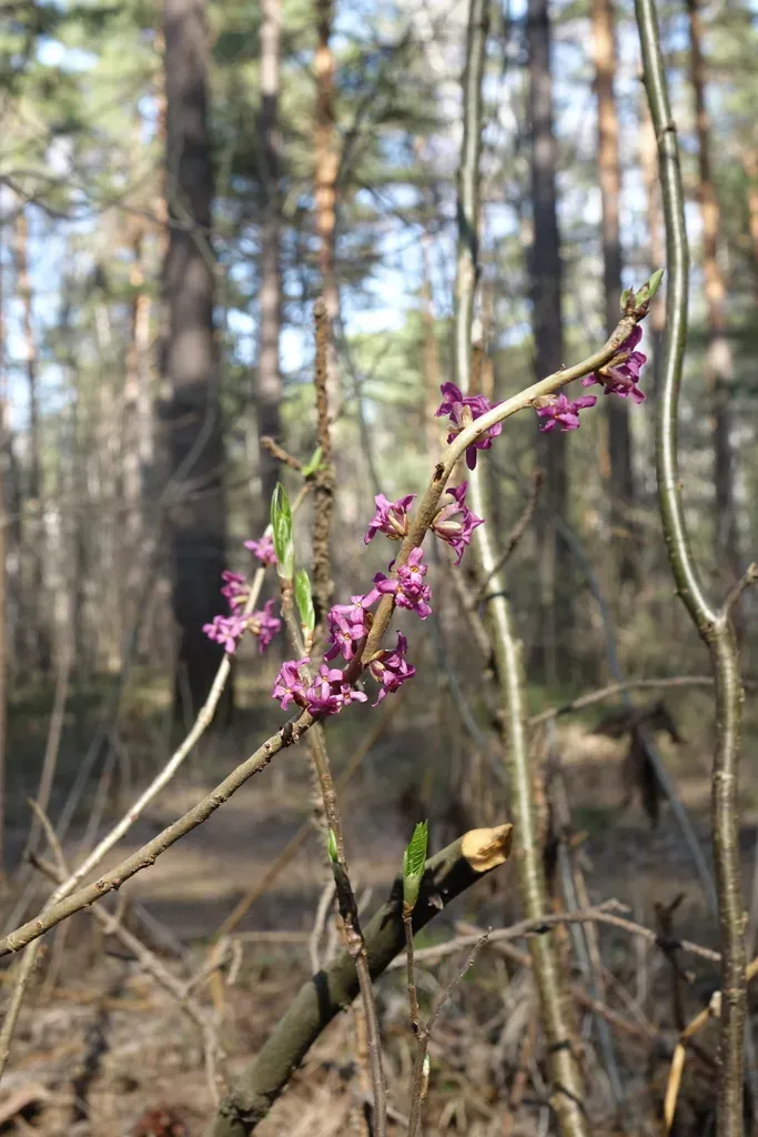 Daphne mezereum is a deciduous shrub known for its fragrant, early-spring flowers and toxic berries.