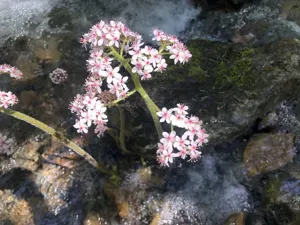 Darmera peltata is a rhizomatous herbaceous perennial known for its large, glossy, rounded leaves and pink flowers.