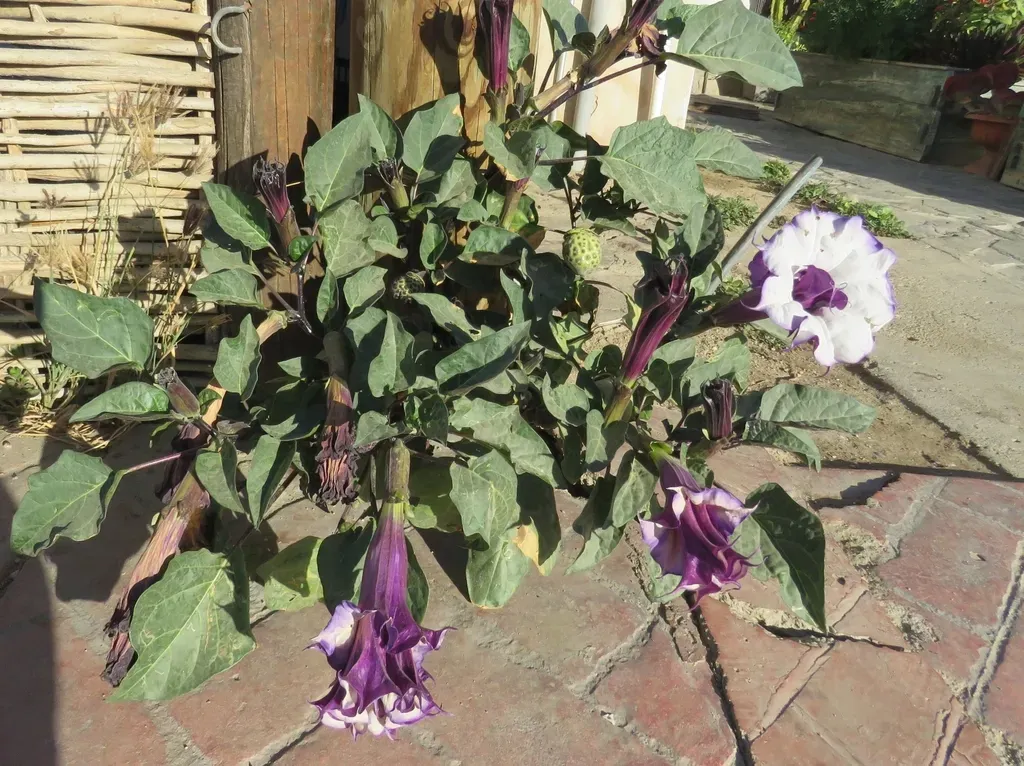 Datura metel is a shrubby, sprawling, short-lived tender perennial or annual plant belonging to the nightshade family (Solanaceae), known for its large trumpet-shaped flowers and toxic properties.