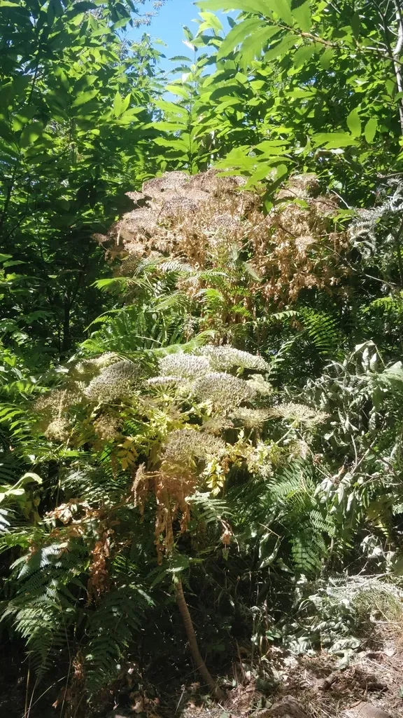 Daucus decipiens is a species of plant in the Apiaceae family, known for its large size, spreading crown, and woody stem resembling a New Zealand cabbage tree. It produces small white flowers with yellow centers and grows in grasslands and open forests at high elevations.