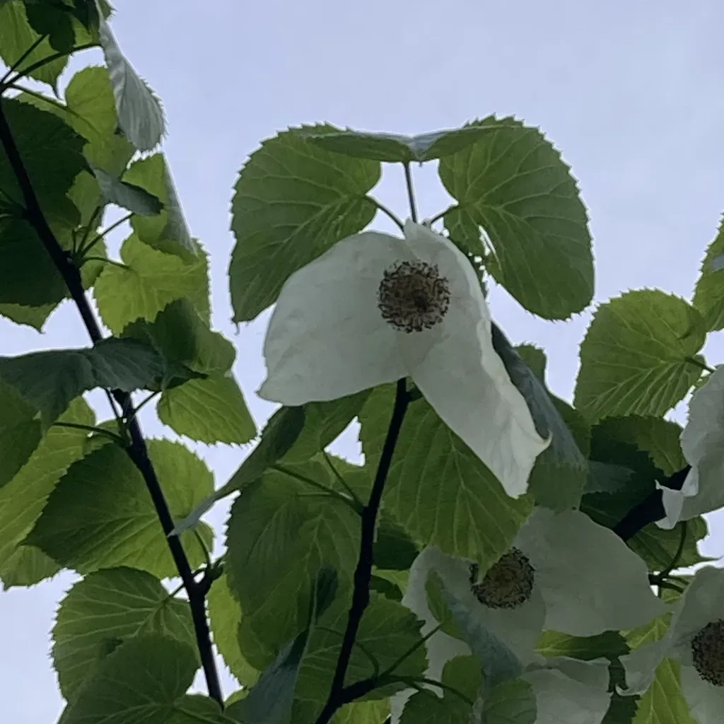 Davidia involucrata is a medium-sized deciduous tree known for its distinctive large white bracts resembling handkerchiefs or doves.