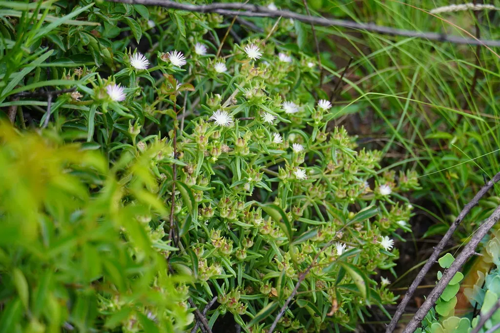 Delosperma herbeum is a succulent, semi-evergreen groundcover known for its white flowers and drought tolerance.