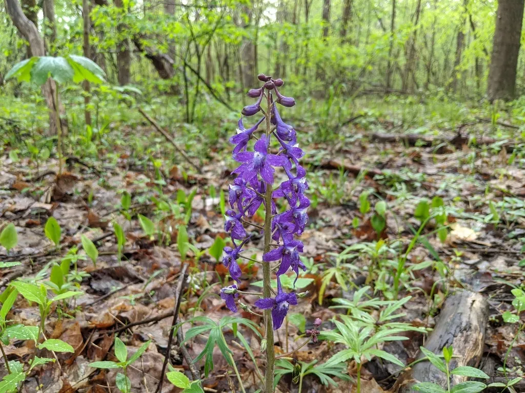 Delphinium tricorne is a perennial wildflower known for its striking blue-purple flowers and early spring bloom.