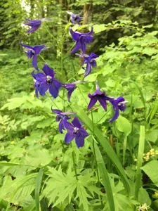 Delphinium trolliifolium is a herbaceous perennial native to the Pacific Northwest, characterized by striking blue flowers with a white petal interior.
