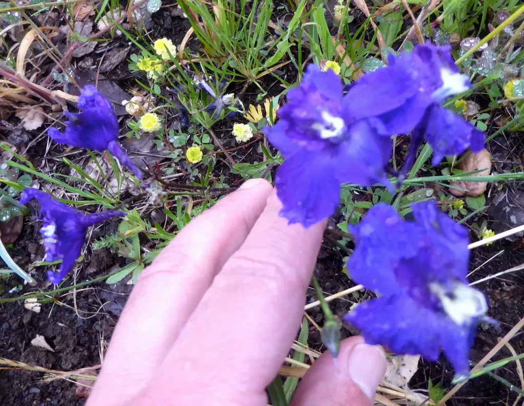 Royal Larkspur (Delphinium Variegatum) is a perennial herb in the Ranunculaceae family with moderate care difficulty. It requires moderate watering and full sun or partial shade light in USDA hardiness zones 7-10. This plant is toxic to cats and dogs — keep it out of reach of pets.
