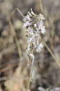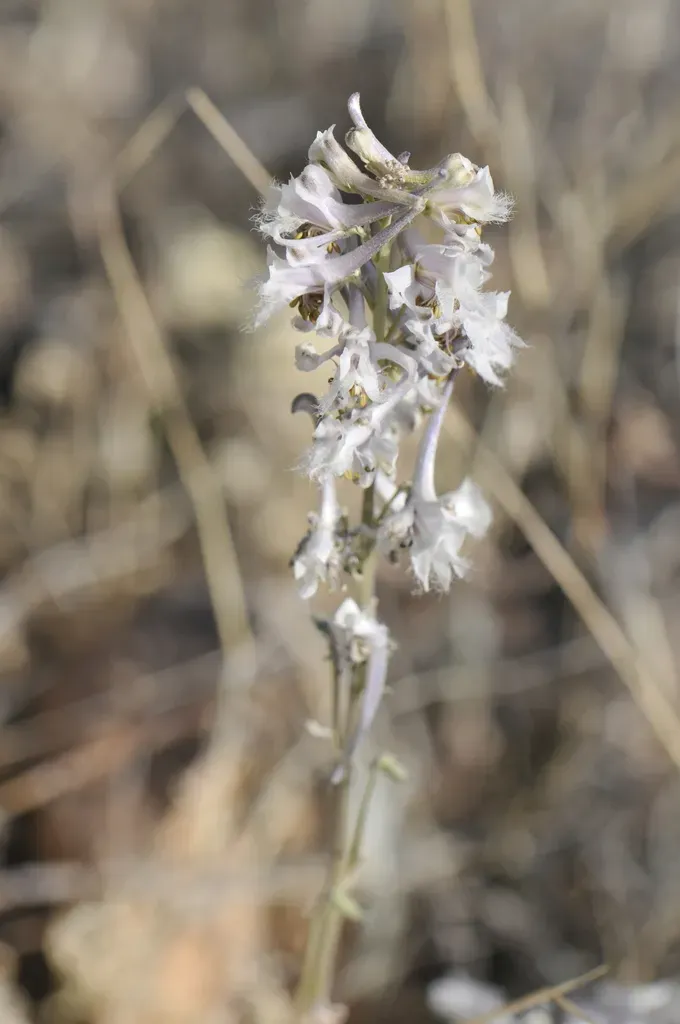 Delphinium wootonii, known as Organ Mountain larkspur, is a perennial herbaceous plant native to New Mexico, characterized by spike-like clusters of pale blue to lavender or white flowers with long spurs.