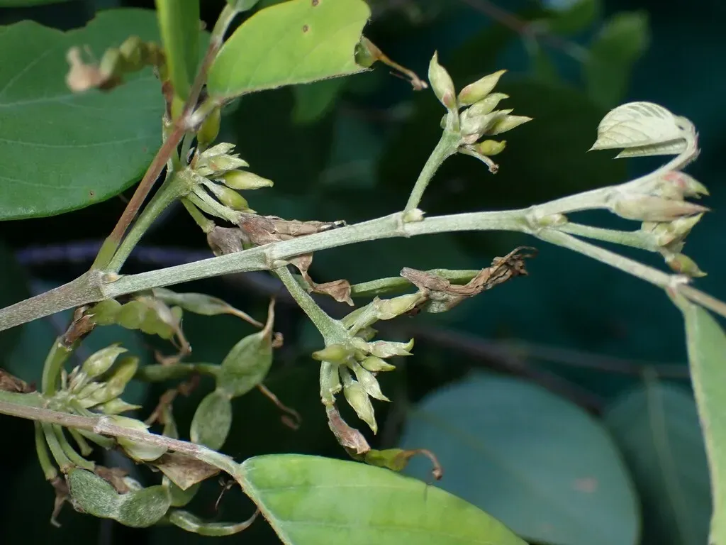 Dendrolobium umbellatum is a bushy shrub or small tree growing 1 to 13 meters tall, with compound leaves and white flowers.