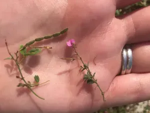 A creeping perennial or annual legume with distinctive jointed seed pods and trifoliate leaves.